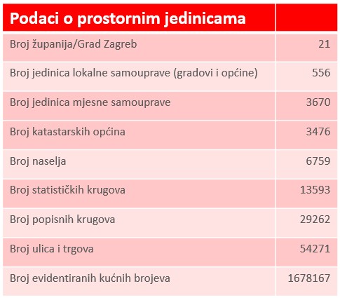 U Registru se vode podaci za sljedeće vrste prostornih jedinica: država, županija i Grad Zagreb, grad, općina, naselje, dostavno područje poštanskog ureda, jedinice mjesne samouprave (gradski kotar, gradska četvrt, područje mjesnog odbora), zaštićena područja, podaci o područjima mjesne nadležnosti katastarskih ureda, kao i podaci o područjima mjesne nadležnosti općinskih sudova, katastarska općina, katastarsko područje na moru, statistički krug, popisni krug, ulica, trg i zgrada s pripadajućim kućnim brojevima.